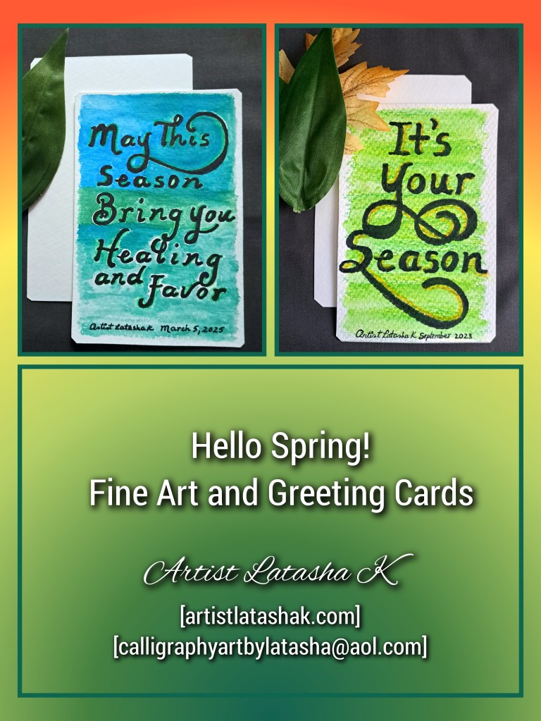 Hello, I am Artist & Tutor Latasha K. I was born in the state of Georgia, USA. My specialty is in drawing, painting, calligraphy, and lettering. I enjoy creating fine art, calligraphy, lettering, and illustrating educational materials. My works are inspirational, elegant, and professional. calligraphyartbylatasha@aol.com
